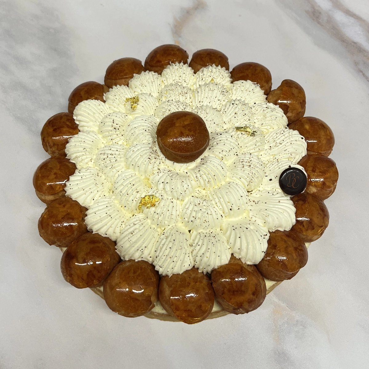 Pâte sucrée aux amandes, caramel au beurre demi-sel, diplomate vanille, choux caramel, crème légère à la vanille Bio de Madagascar.