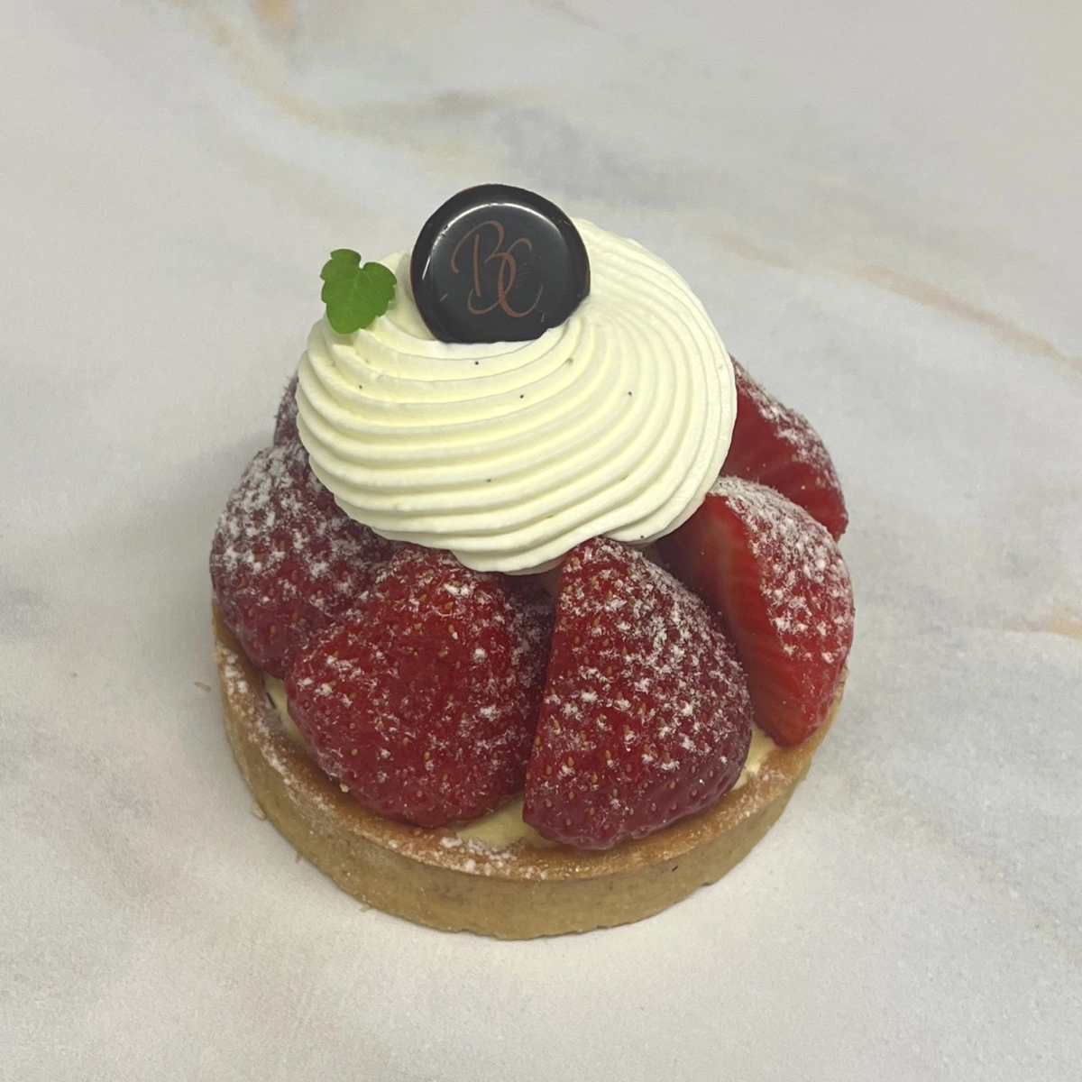 Pâte sucrée aux amandes, confit de fraise, diplomate vanille, fraises fraiches, crème légère vanille Bio de Madagascar.